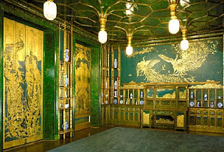 Many of the ideas underpinning this style came from James McNeil Whistler (1834-1903) who advocated "art for arts sake" That is, art was to be beautiful because of what it looked like, rather than having a purpose, like advancing a political or sociological agenda. Its whole purpose was its appearance, not a moral to be taught or a narrative. The earliest phase of these ideas were mostly manifested in the decorative arts and architecture. Owen Jones (1809-1874) published in 1856 "A Grammar of Ornament". This was a profusely illustrated catalogue of ornamental designs from all cultures and periods. Artists and designers plundered the book for the rest of the century, mixing and matching styles and patterns to create the Victorian styles, of which the aesthetic period was a late variation, This style was only popular for the 1880's. Below is an example of aesthetic movement design, Whistler's Peacock Room, from 1877. Below that is an example of aesthetic period furniture.