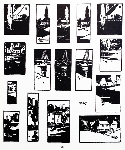 Above is an example of the simplified Notan sketches that Dow advocated. As you can see he is pushing a single picture idea through various treatments of value and arrangement, looking for an artistic presentation of his subject. They are all of the same house and tree but with different value arrangements and different "treatments" had by varying his interest in different parts of the image. Some emphasize the tree for instance and others the architecture. In some he switches the values about at will using a dark tree in one and a high value tree in another.