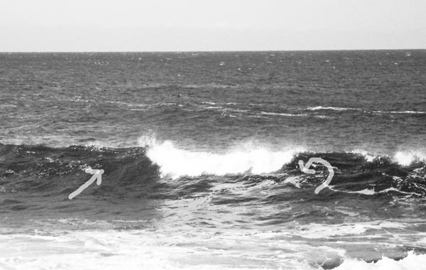 The back of the wave is visible in this picture, below that the water becomes more aerated and then turns to foam. Below is a diagram of the surface of the water. As I explained last night, most of this water is a skin over the forces below, being stretched more than moved by the force of the rolling orb hidden beneath it. Oh, do do da day!
